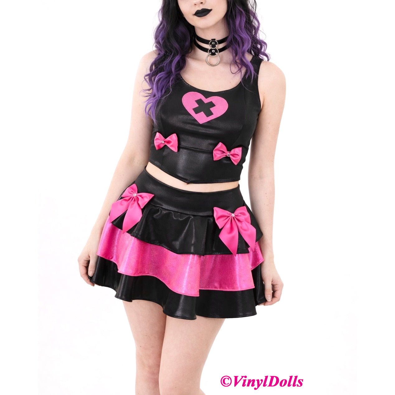 ☆ Skirt - The skirt is a full circle cut, triple layered, Skater skirt. Made with black and pink 4 way stretch spandex, Featuring two pink bows. will fit comfortably on your mid or upper waist (for the size measure around your actual waist) (see size chart below).